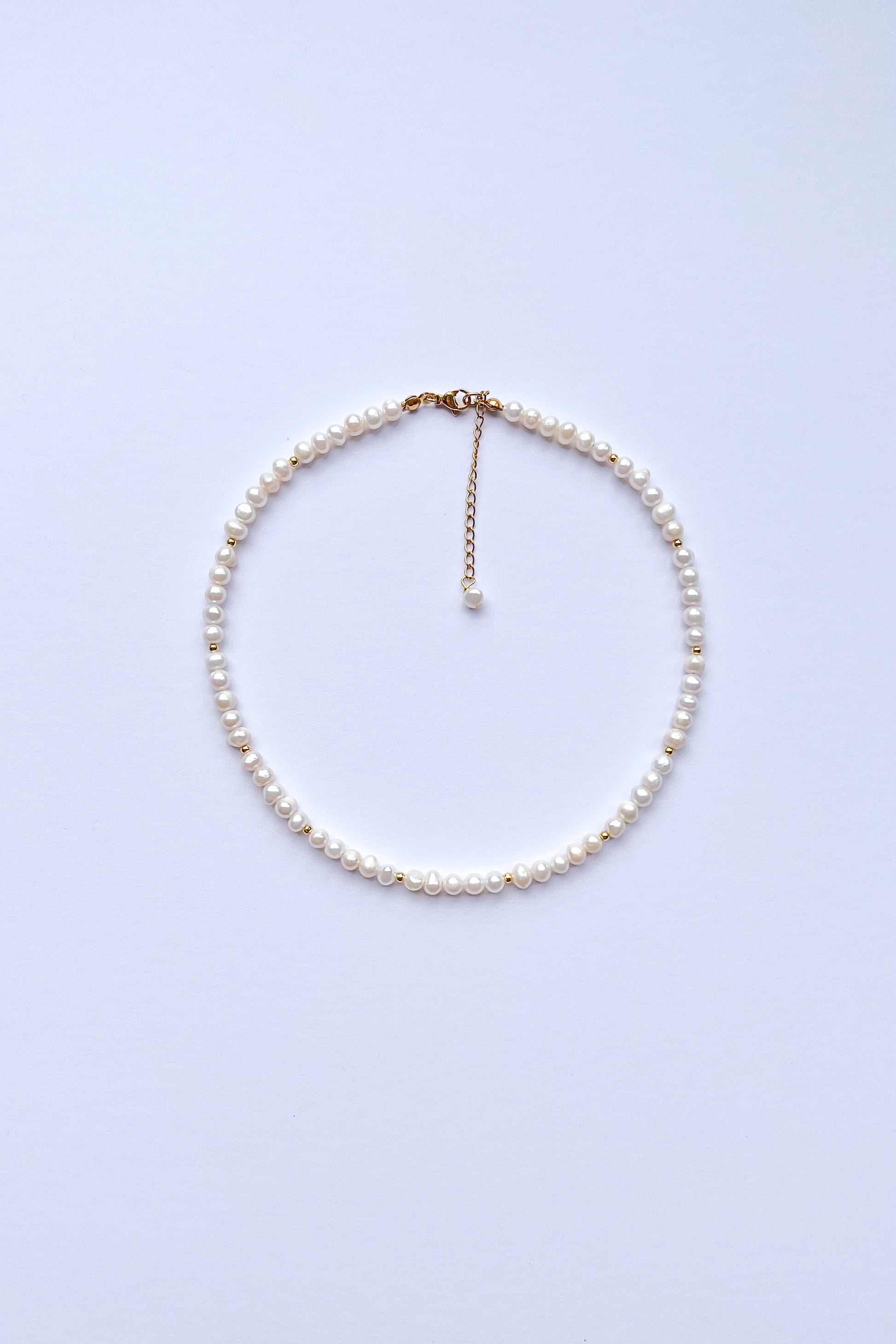 Classic Freshwater Pearl necklace with 18k gold plated stainless steel finish.