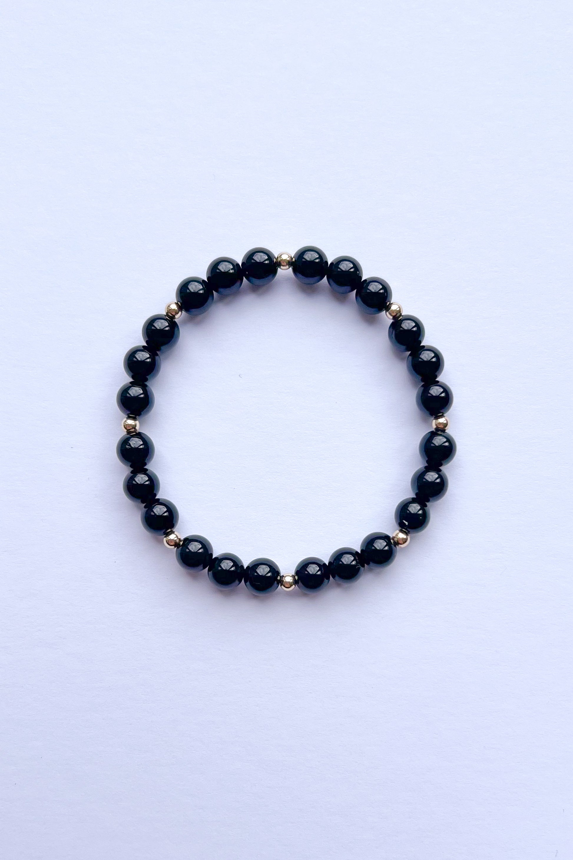 Elastic Bracelet available in 2 sizes, made with Black Onyx beads and gold filled spacers.