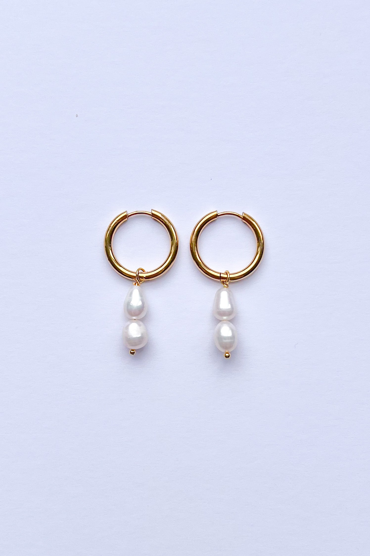 Freshwater Pearl drop hoop earrings with 18k gold plated stainless steel finish. Please note earrings are non returnable due to hygiene reasons.