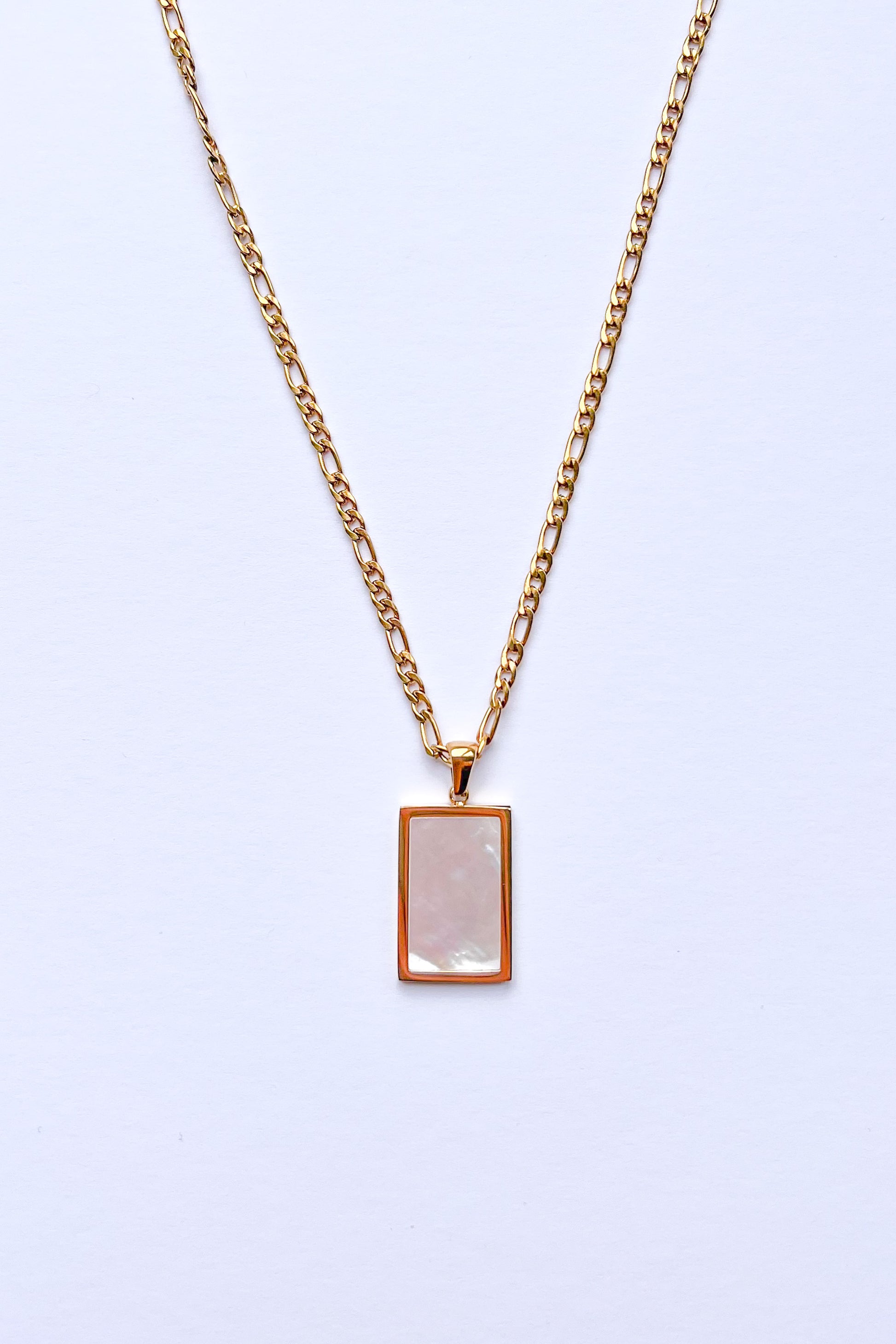 Rectangle Pearly necklace with 18k gold plated stainless steel finish.