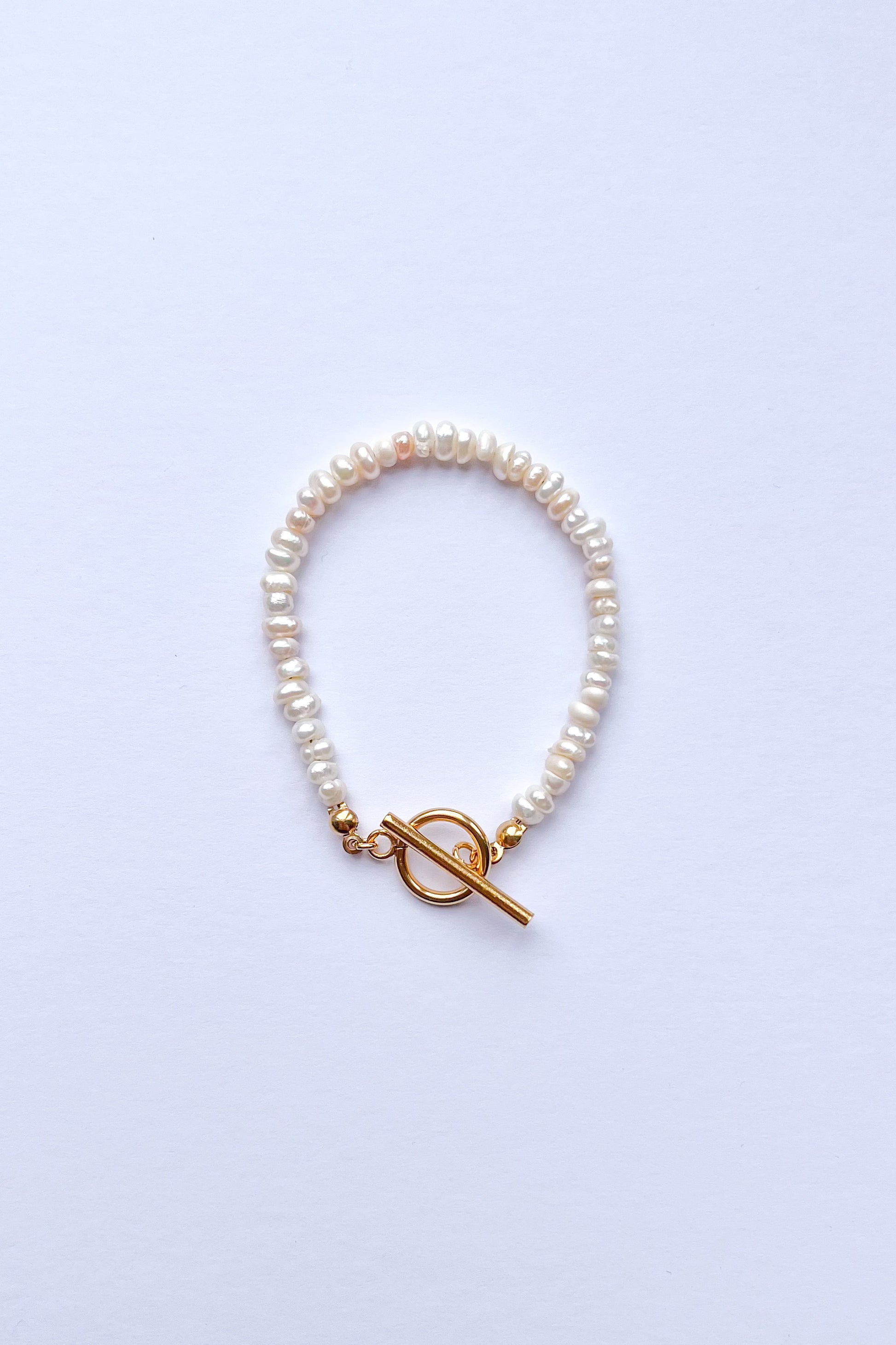 Toggle Clasp Freshwater Pearl bracelet with 18k gold plated stainless steel finish.